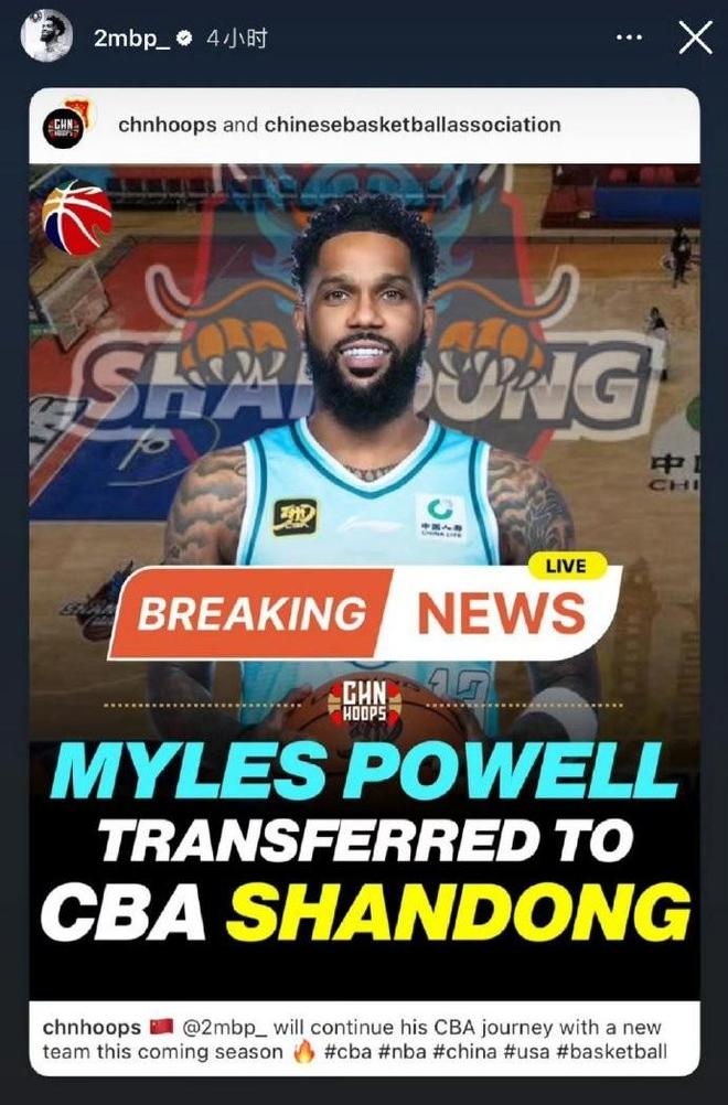 鲍威尔社媒宣布:自己新赛季将加盟CBA山东男篮